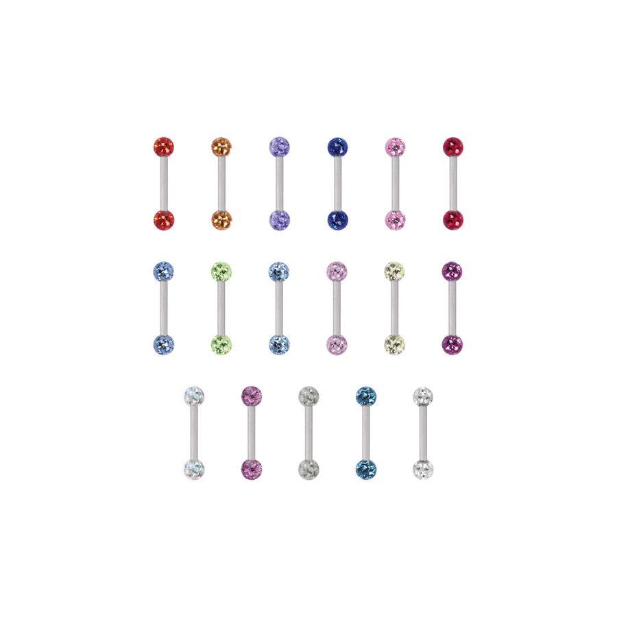 Die Titan Highline® Sealed Jewelled Barbells haben eine Stabstärke von 1.2 mm. Die Kugeln des Barbells sind mit edlen Kristallen besetzt und versiegelt. Der Stab ist externally threaded, die Kugeln lassen sich auf die Außengewinde unserer externally threaded Barbells schrauben.