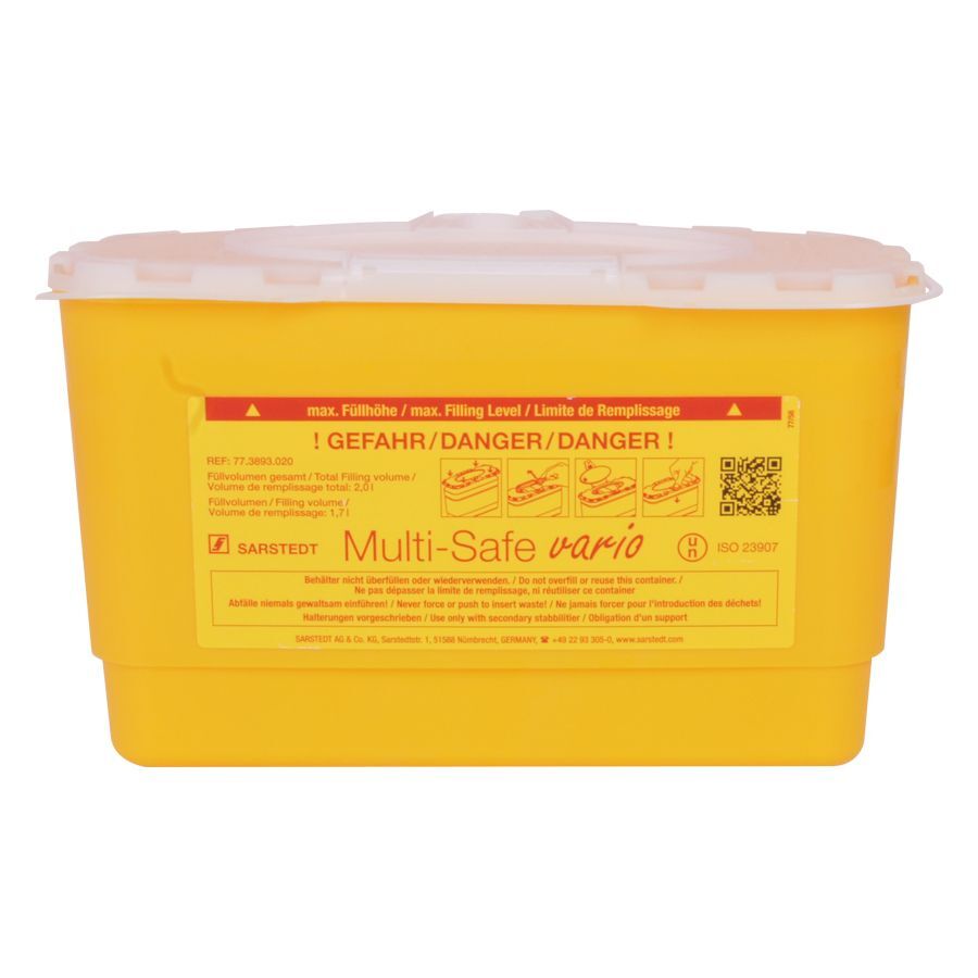 426255, Abwurfbehälter Rigi Box Vario 2000, ist ein besonders widerstandsfähiger Sicherheitsbehälter für Kanülen mit Abdreh- und Abzieheinrichtung im Deckel. Die Entsorgungsbox ist auslauf- und geruchssicher zu verschließen.