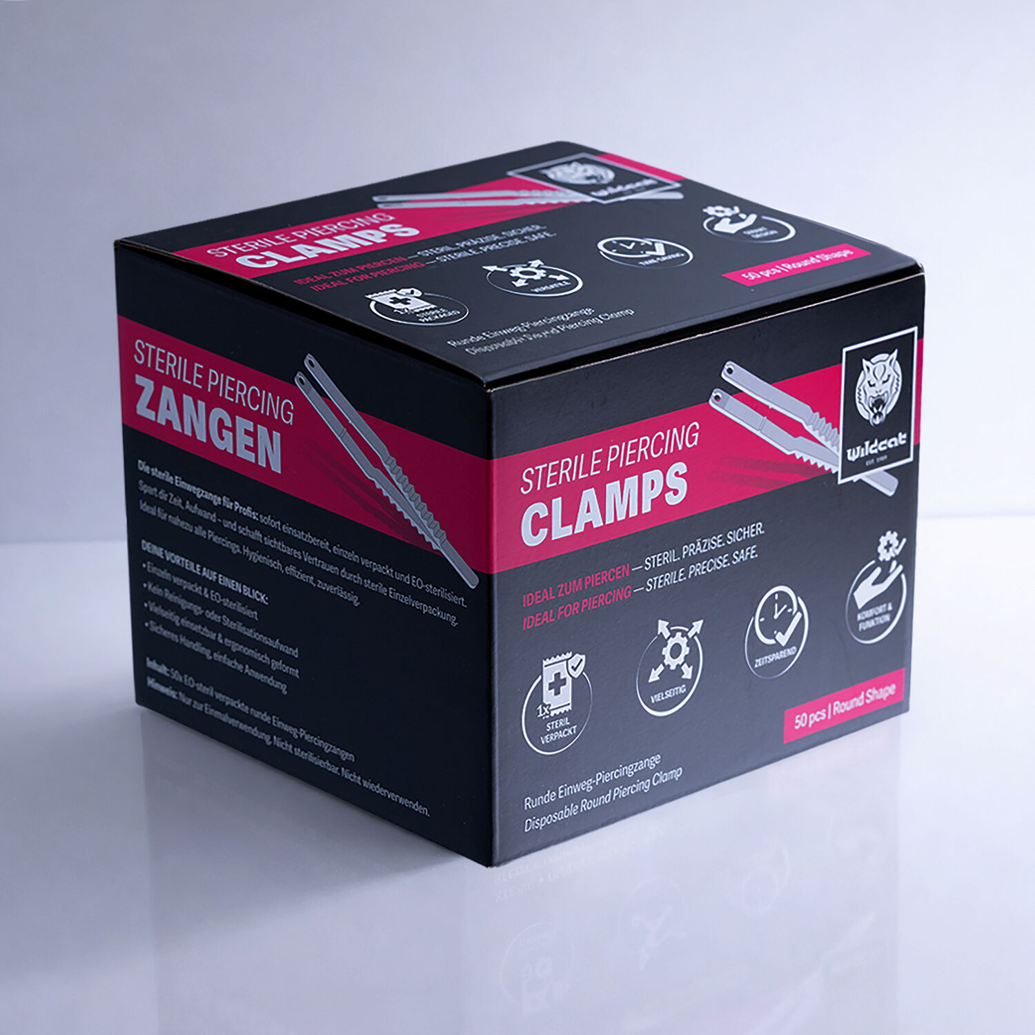 The Wildcat sterile round piercing clamps are designed for professional studio workflows. Each clamp is individually sterile packed and EO sterilized (ethylene oxide) to ensure maximum hygiene and safety during use.