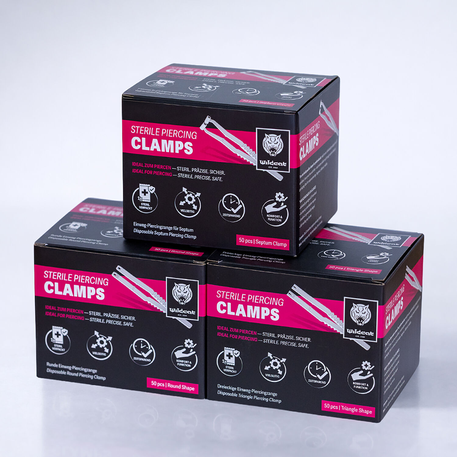 The Wildcat sterile triangle piercing clamps are designed for professional studio workflows. Each clamp is individually sterile packed and EO sterilized (ethylene oxide) to ensure maximum hygiene and safety during use.