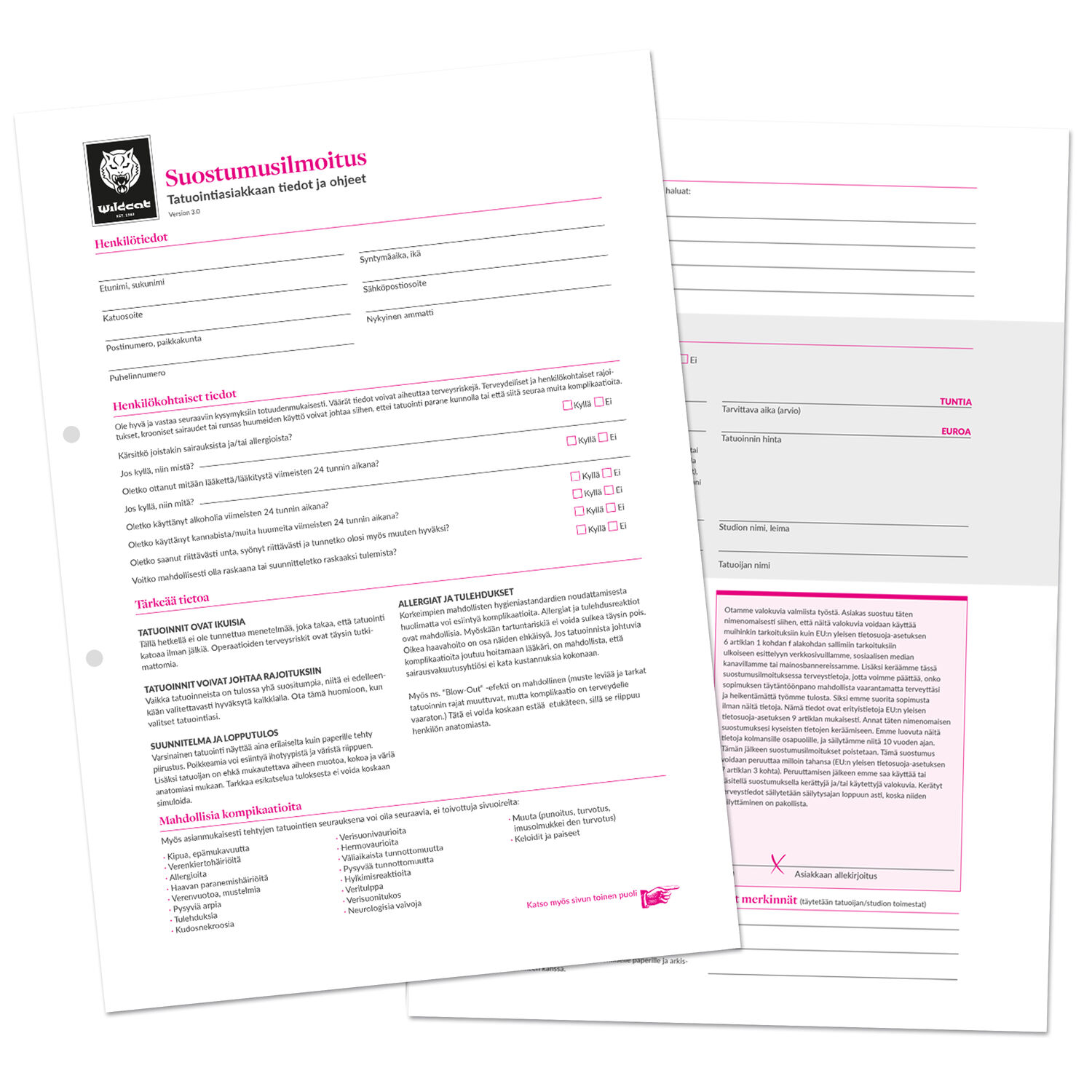 Pad of 50 consent forms for tattoo artists in Finnish language. The forms are clearly structured, easy to understand, and printed double-sided on each sheet. Double pre-punched holes allow easy filing, while the glued top ensures clean removal. GDPR-compliant and ideal for professional studio use.