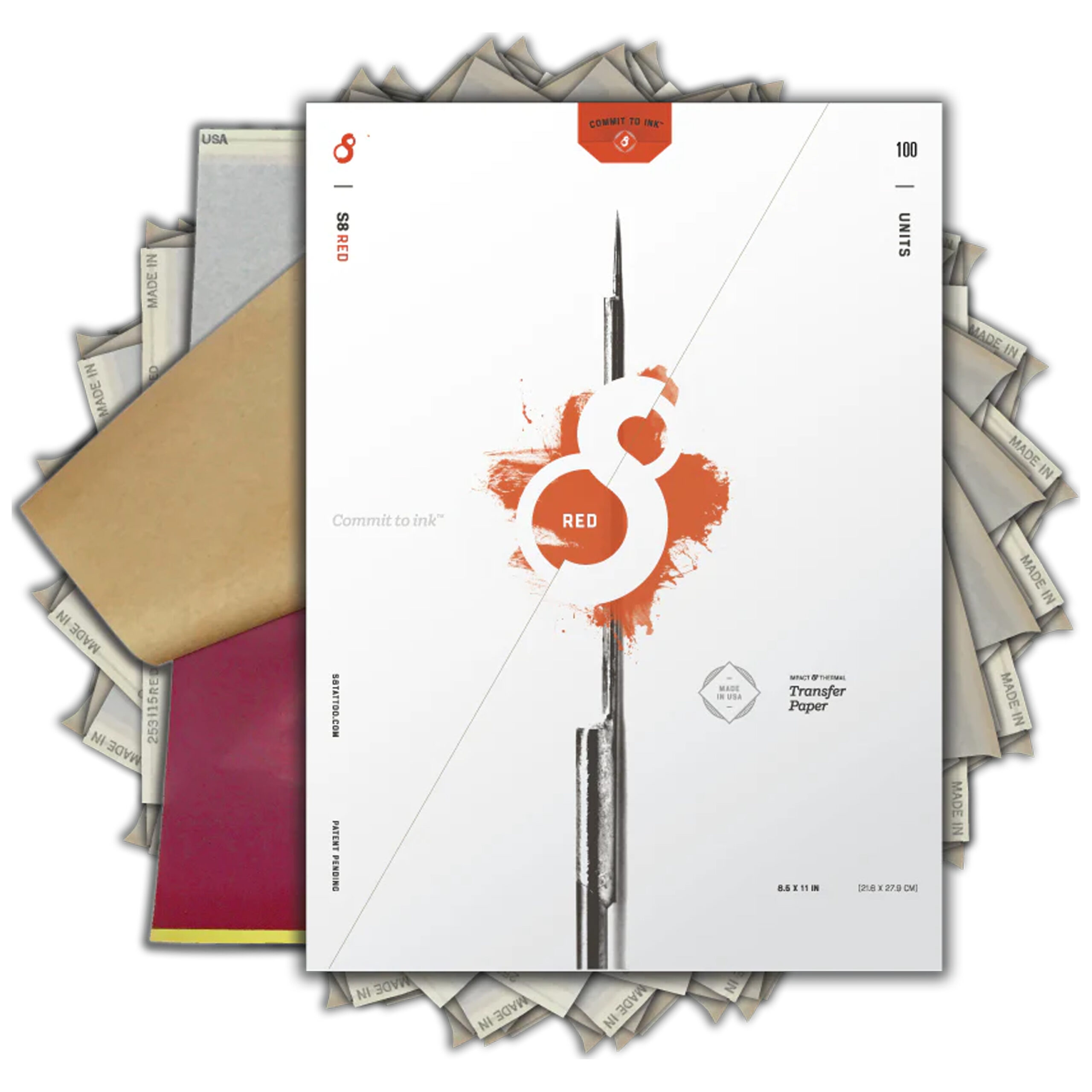 S8 Red Tattoo -tatuointien siirtopaperi on ensimmäinen punainen värillinen siirtopaperi, jota voidaan käyttää sekä vapaalla kädellä että lämpökopiokoneessa.